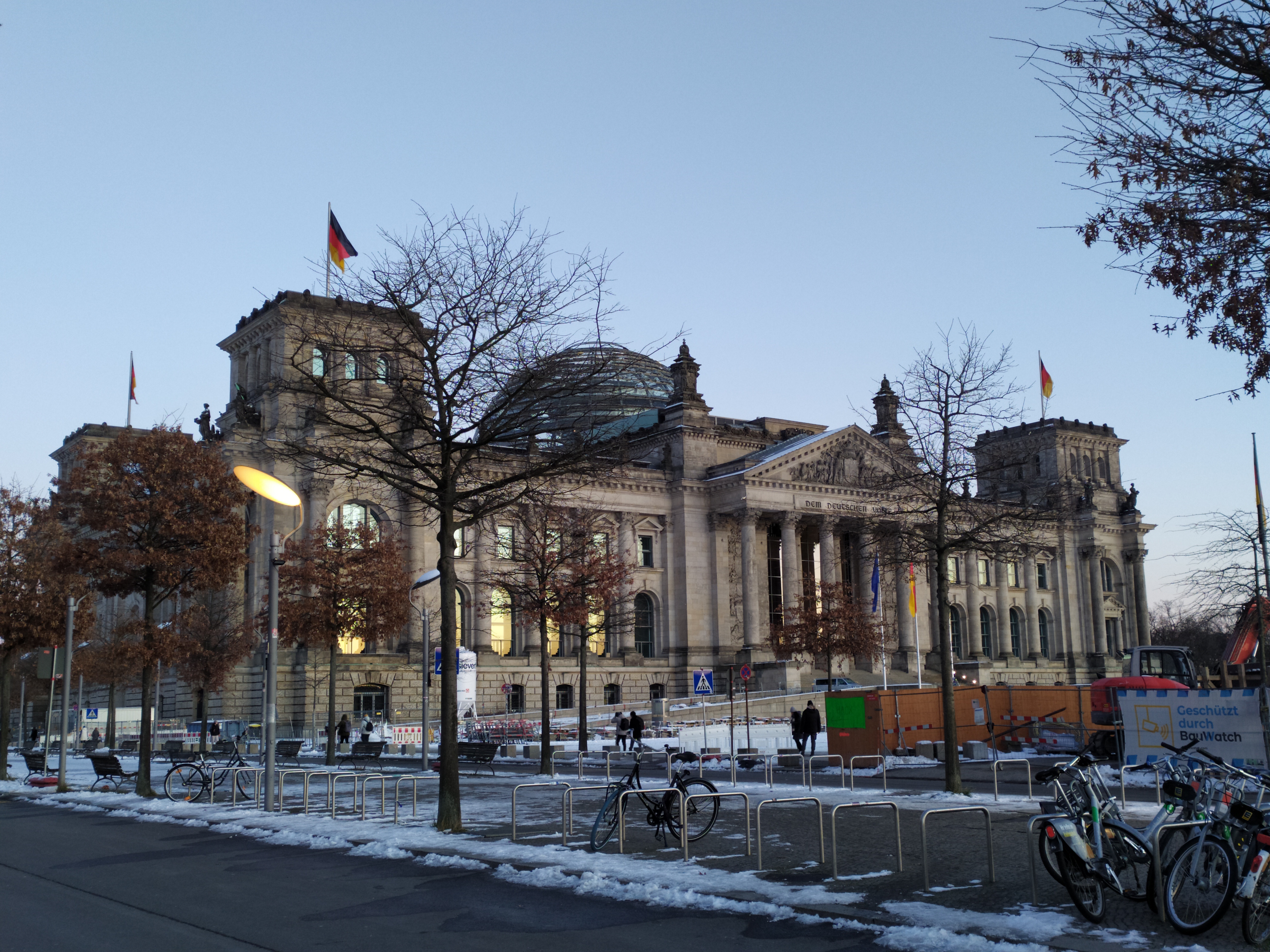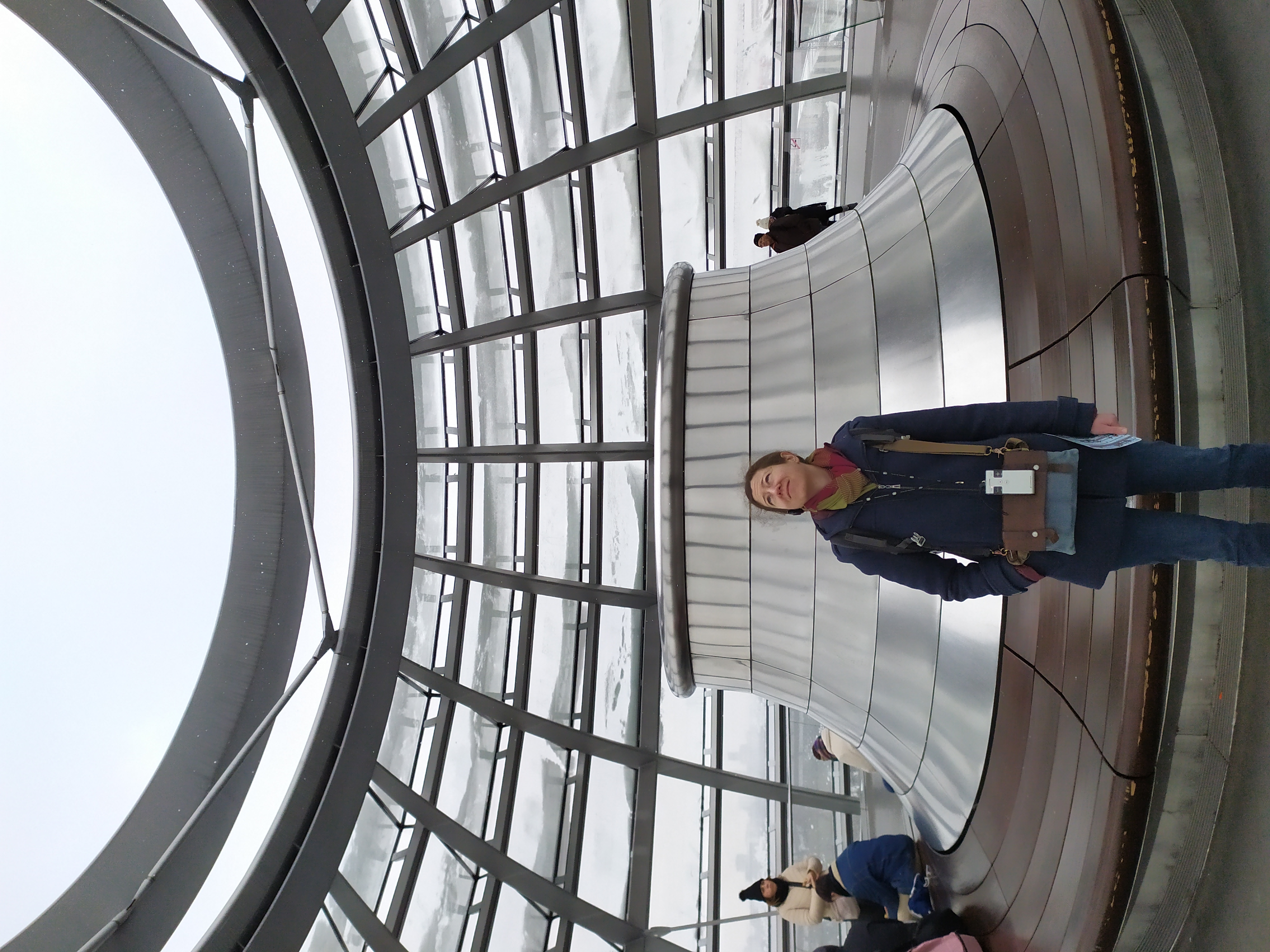 Nous nous résignons à ne pas déambuler parmi les stèles du mémorial de l'holocauste car les allées sont verglacées. Nous anticipons donc notre visite de la coupole du Reichstag. Encore une fois on fait peu de cas de notre avance tandis que nous présentons en bloc notre "groupe de deux personnes" ainsi qu'exigé par le mail confirmant la réservation. Nos identités déclinées et nos sac rayon-ixés nous sommes guidées dans un ascenseur gigantesque qui nous emmène à toute vitesse sur le toit terrasse.